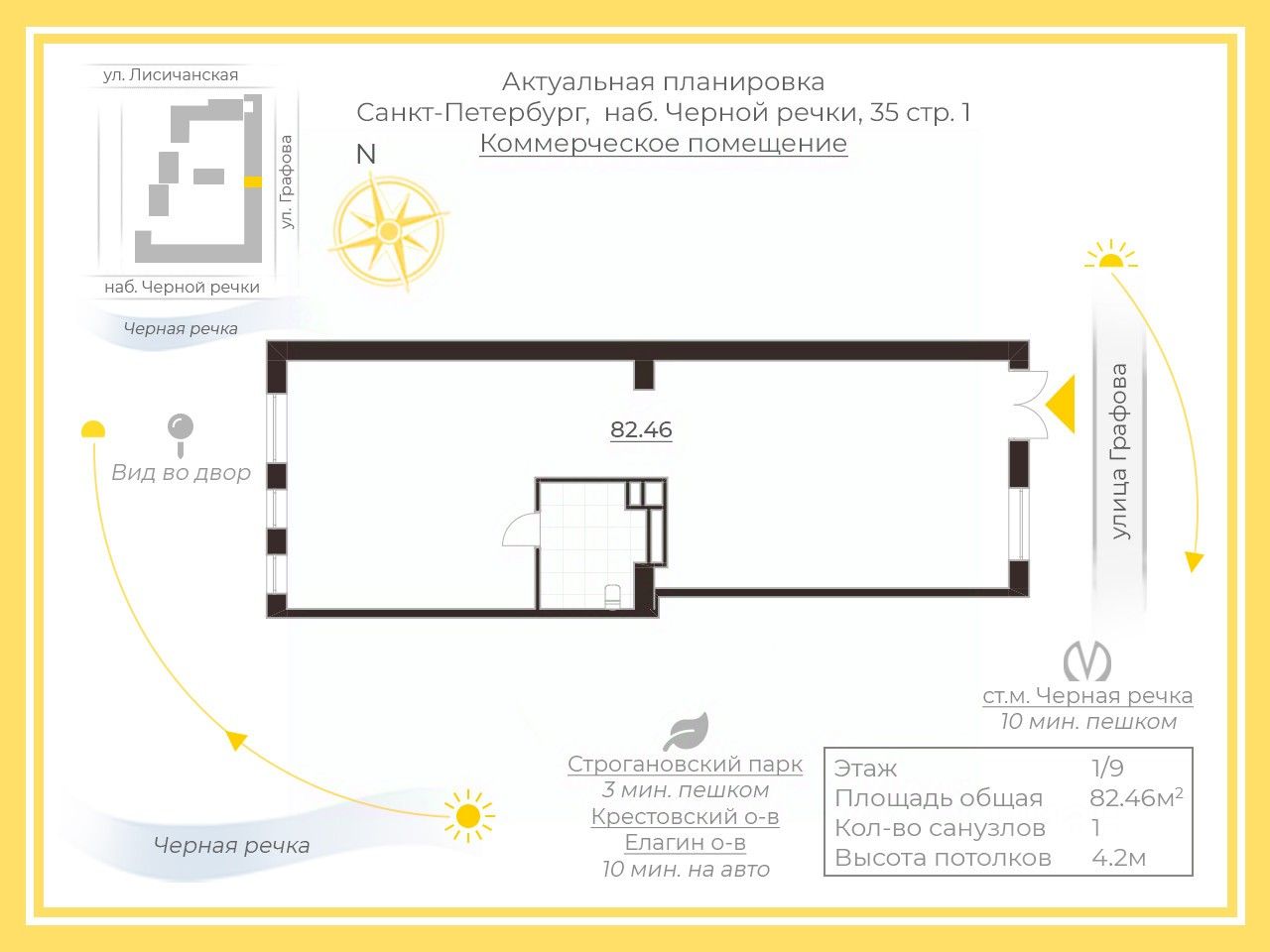 Помещение выходит на улицу Графова - одна витрина и вход с вывеской, три окна - выходят во двор и подходят для размещения рекламной информации. Хороший пешеходный трафик, рядом набережная Черной речки и мост в Строгановский парк, метро Черная речка - 10 минут пешком от дома.