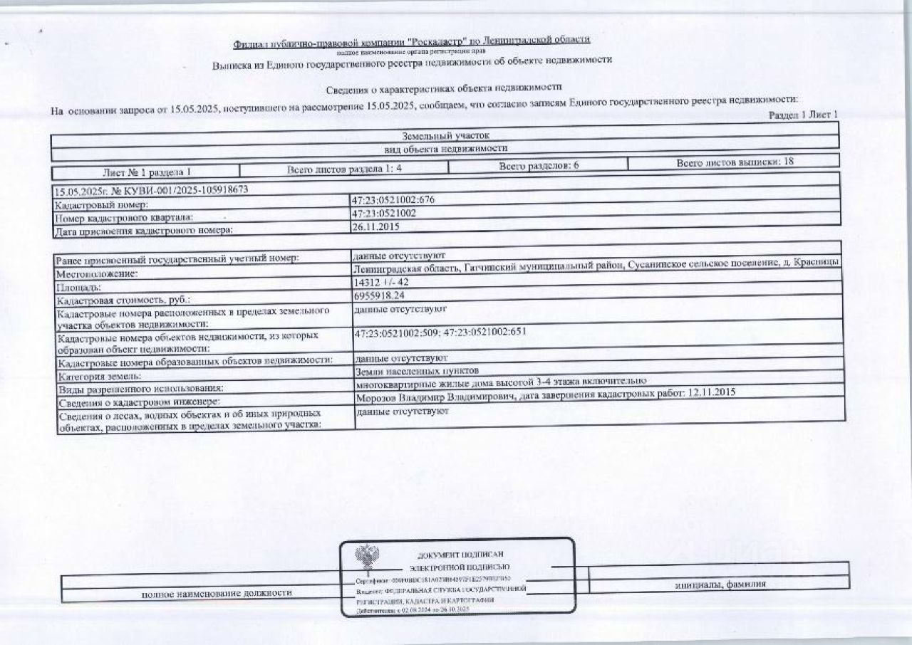 Подвергнутое аресту принадлежащее должнику ООО СЗ Гатчинская Гольф-деревня имущество: Земельный участок, площадью 14312 +/- 42 кв. м., расположенный по адресу: Ленинградская область, Гатчинский м. р, Сусанинское сп, д. Красницы, кад. 47:23:0521002:676. Обременение ограничения прав на земельный участок, предусмотренные ст. 56 Земельного кодекса РФ, запреты регистрационных действий ФССП.
