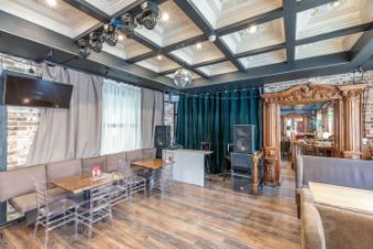 Полы и двери (дверные проемы)из массива дуба, на потолке лепнина, барная стойка из массива дуба выполнена на заказ, кожаные диваны и кресла, столы и стулья привезены из Праги. Продуманный интерьер, четыре зала, 150 посадочных мест. Полностью укомплектован штат.