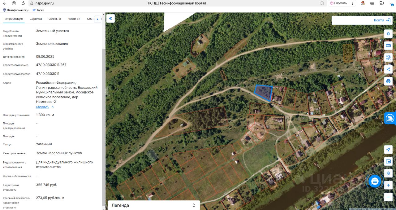 Земельный участок с КН 47:10:0303011:267, расположенный по по адресу: Ленинградская область, Волховский муниципальный район, Иссадское сельское поселение, дер. Немятово-2 площадью 1300 кв.м, разрешенное использование - для индивидуального жилищного строительства.