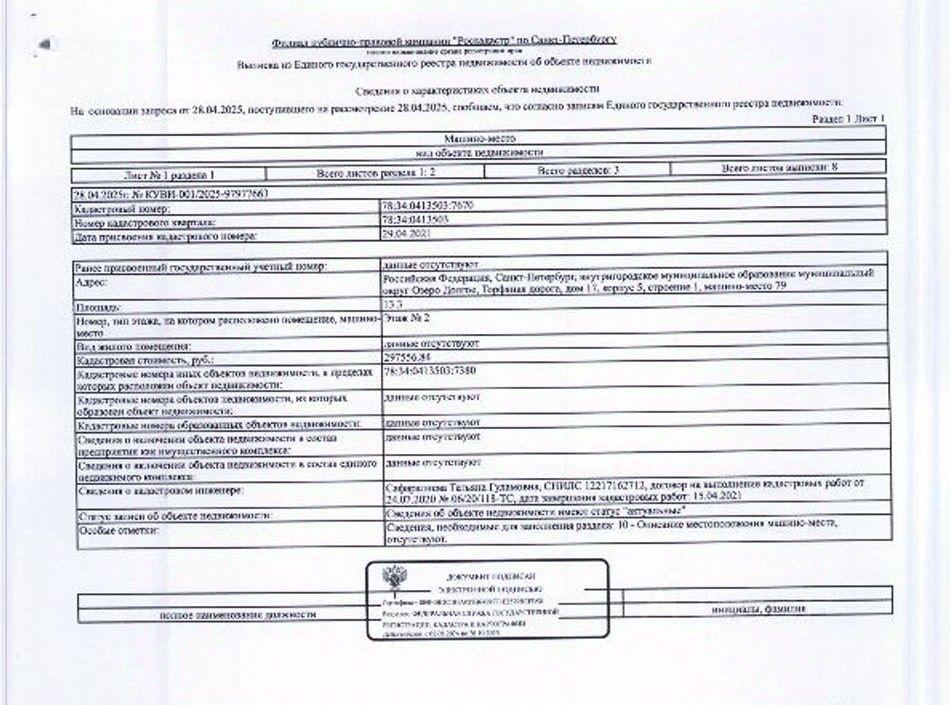 машино-место по адресу: г. Санкт-Петербург, внутригородское муниципальное образование муниципальный округ Озеро Долгое, Торфяная дорога, д.17, корп. 5, стр. 1, общ. пл. 13,3 кв.м., кадастровый номер 78:34:0413503:7670, машино - место 79