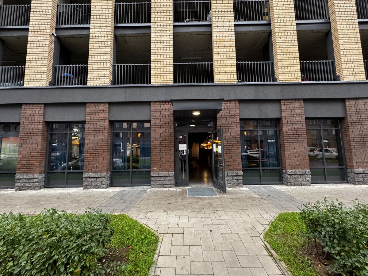4 входа: два парадных (на оживленный Дунайский проспект и во двор ЖК) и два технических для разгрузки.