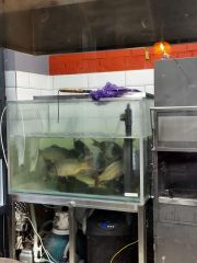 Профессиональная кухня со всей необходимой техникой: 4 зоны готовки (холодные, горячие цеха), отдельная зона мойки, аквариум для рыбы с системой охлаждения и очистки.