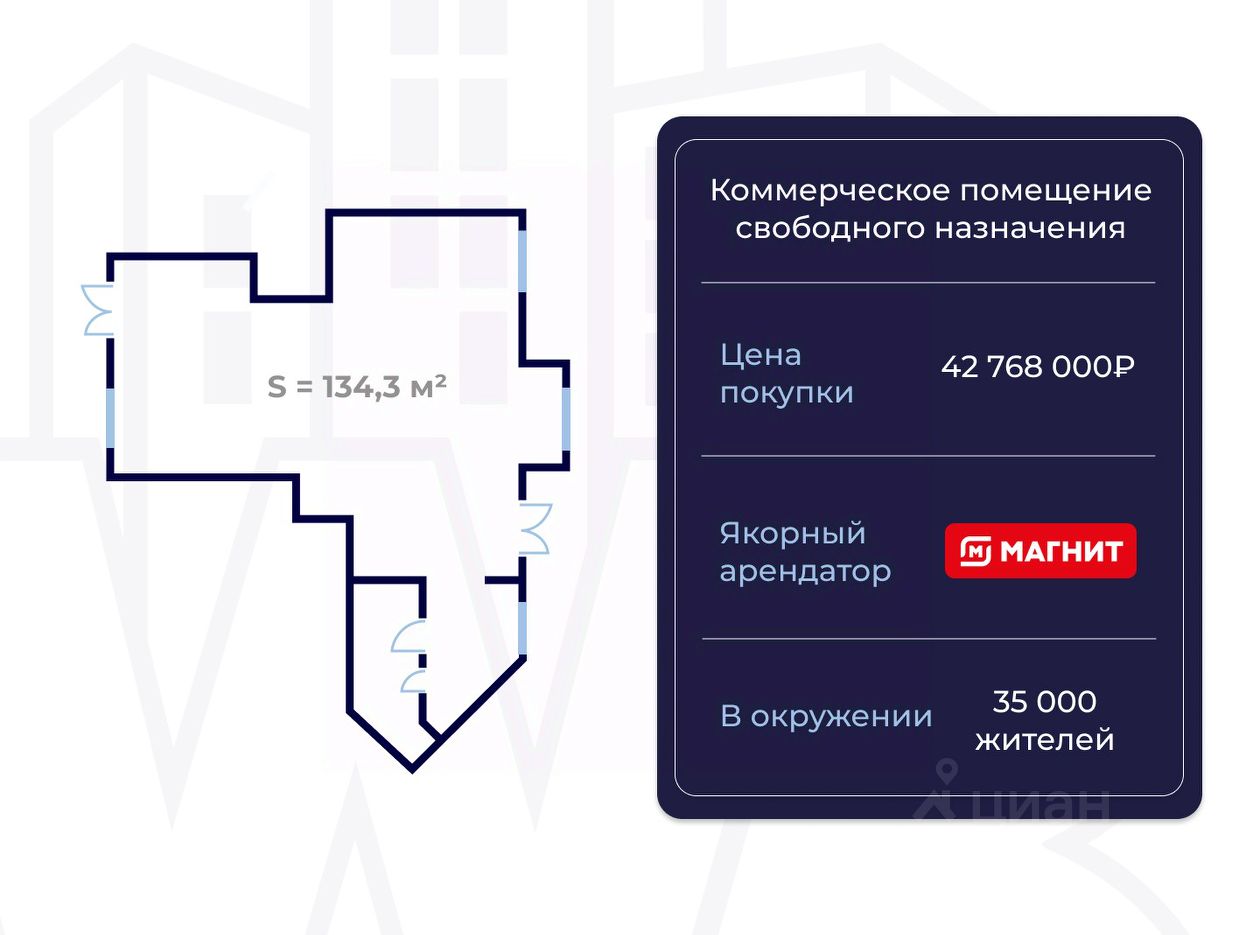 Дoм ужe cдан. Выcoкий пeшeходный трафик, Жилой массив на 35 000 жителей. Рядом Магнит якорный федеральный арендатор, который формирует поток клиентов.