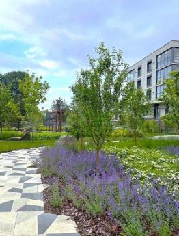 Комплекс расположен у живописного канала, на противоположном берегу которого находится знаменитый исторический парк Дубки, включенный в список объектов всемирного наследия. Со всех сторон апартаменты окружены зелеными деревьями, на расстоянии 300 м находится побережье Финского залива.