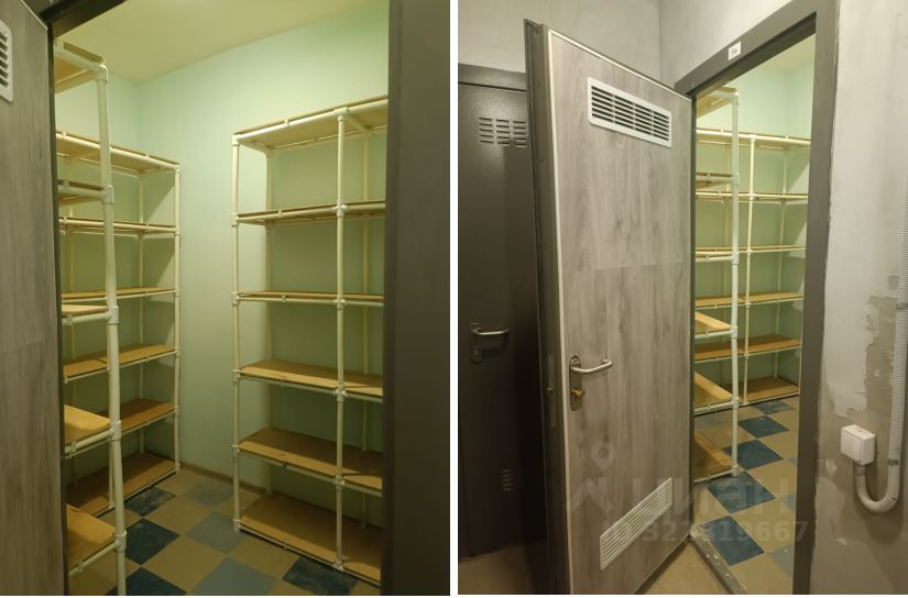 В помещeнии сделaн peмoнт. Нa полу кафельная плитка, стены оштукатурены и покрашены, металлическая дверь усилена, утеплена и отделана ламинатом. Смонтирован полипропиленовый стеллаж (не подвержен коррозии) по 3 стенам. Можно передвигать, если есть необходимость.