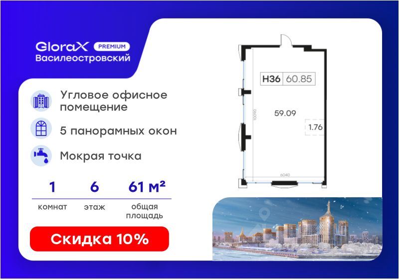 Продается офисное помещение - 60,85 кв.м. в премиальном проекте GloraX Premium Василеостровский.
