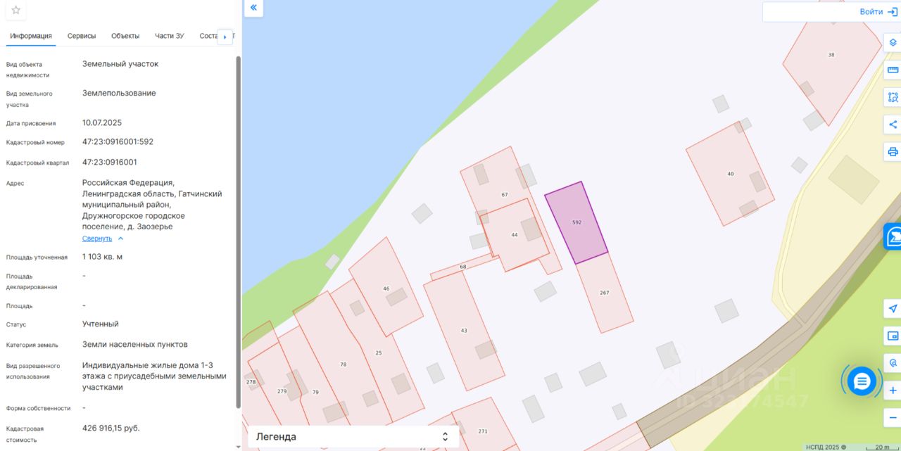 Земельный участок с кадастровым номером 47:23:0916001:592, площадью 1103 (одна тысяча сто три) кв.м., расположен по адресу: Российская Федерация, Ленинградская область, Гатчинский муниципальный район, Дружногорское городское поселение, д. Заозерье. Категория земель: земли населенных пунктов. Разрешенное использование: индивидуальные жилые дома 1-3 этажа с приусадебными земельными участками. Граница земельного участка установлена в соответствии с требованиями земельного законодательства. Сведения об обременениях: не установлены.