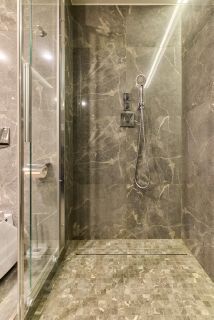 Санузел: Приравнен к стандартам премиальных отелей ( 5 Звёзд ). Стены и пол Итальянский керамогранит, подвесная сантехника от Duravit или Villeroy & Boch, смесители скрытого монтажа. Климат-контроль на базе системы "Умный дом".