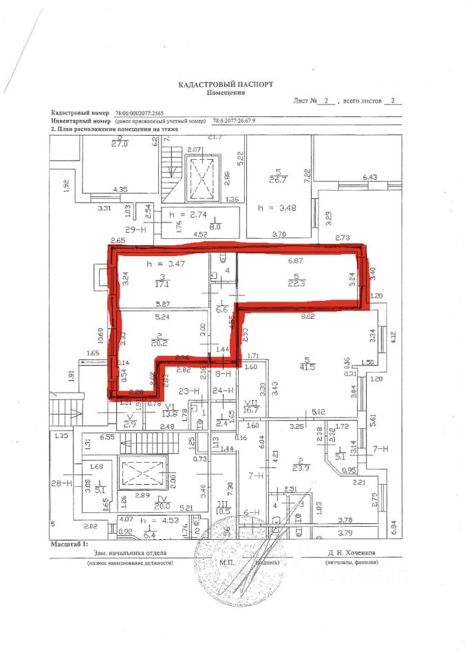 Офис состоит из трёх изолированных комнат (кабинетов) по 17, 20 и 22 кв.м. соответственно, а также санузла (4 кв.м.) и коридора-прихожей (6,6 кв.м.).