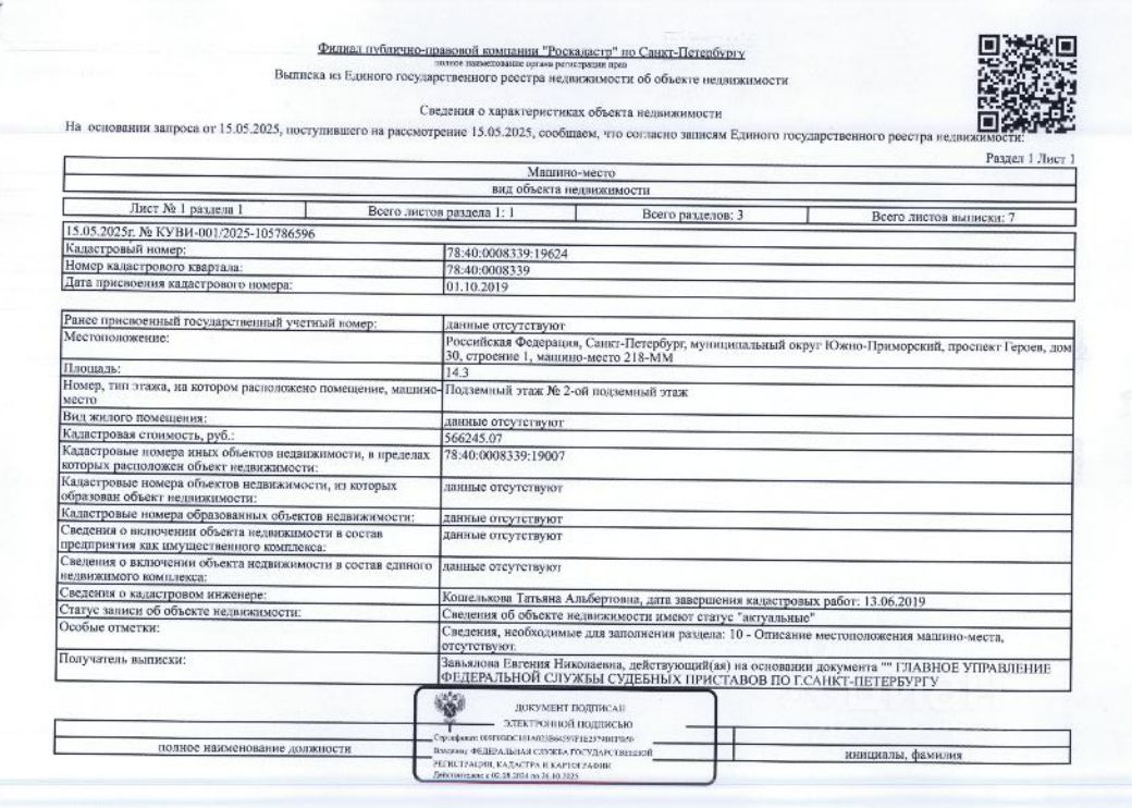 Лот1(повторные) Подвергнутое аресту СОСП ГМУ по и/п 96052/24/98078-ИП от 17.06.2024 и принадлежащее должнику Рябухиной Г.П. арестованное имущество: Машино-место общ.пл. 14.3 кв.м., расположенное по адресу: Санкт-Петербург, МО Южно-Приморский, пр. Героев, д. 30, стр. 1., кадастровый номер 78:40:0008339:19624