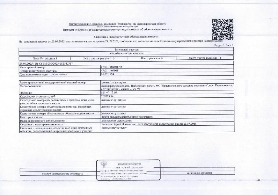 земельный участок, кад.47:01:1404001:93, пл. 861+/-12,66 кв.м., расположенный по адресу: Ленинградская область, Выборгский район, МО "Красносельское сельское поселение", пос. Кирилловское, с.т."Звёздочка", массив 2, уч. 93