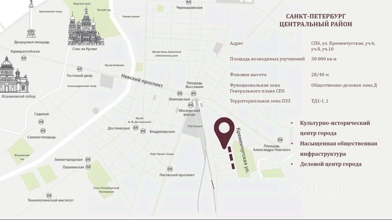 Участок расположен рядом с Московским вокзалом, в непосредственной близости от Невского проспекта и Лиговского проспекта. В пешей доступности две станции метрополитена Площадь Восстания и Площадь Александра Невского. Отличная транспортная инфраструктура, высокая пешеходная проходимость. Участок расположен на фасадной линии большого жилого и делового массива на улице Кременчугской.