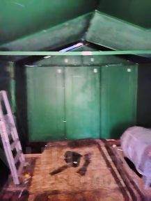 В очень хорошем состоянии(коррозии и ржавчины нет). Год назад отремонтировал и покрасил двойным слоем каждую секцию. Сейчас гараж в разобранном виде находится в сухом помещении. В комплекте все болты и гайки, в том числе внутренний замок с двумя ключами.