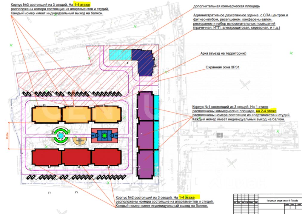 Готовый проект: Разработан и согласован генплан с размещением трех корпусов с апартаментами и коммерческими помещениями. Есть возможность организации посуточной аренды.