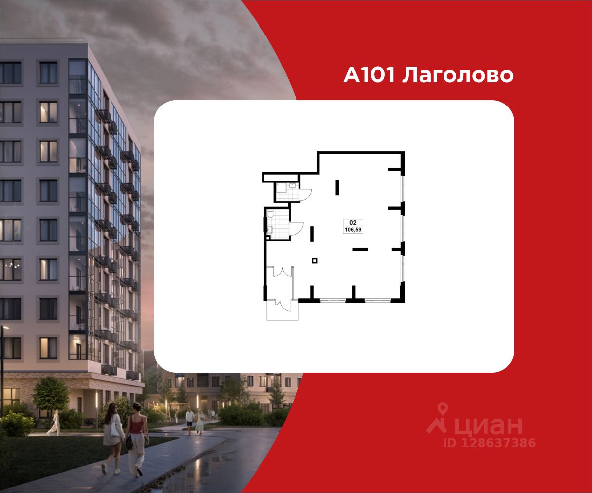 Продажа торгового помещения 106.59 м² в ЖК "А101 Лаголово" от застройщика. Опция "готовый арендный бизнес". Рассрочка на 12 мес. В 2026 году сдается первая очередь на 5.000 жителей. Дом 1.3.4.4, будет заселен в 2028 году.