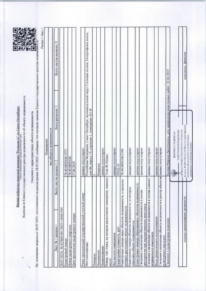 Нежилое помещение 161-Н, расположенные по адресу: Санкт-Петербург, Сосновая Поляна, Петергофское шоссе, д. 84, корп. 19, стр. 1общ. пл. 3 кв.м. кад 78:40:0850106:3573