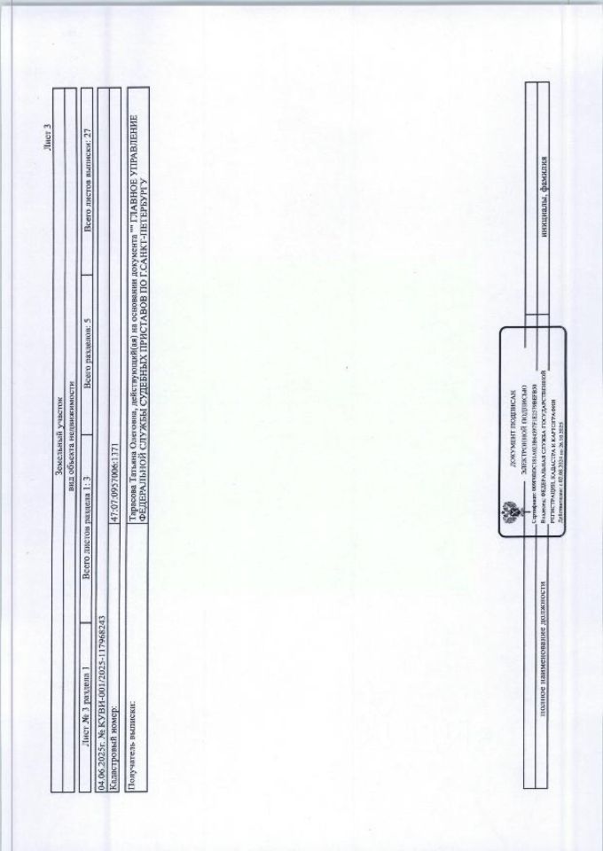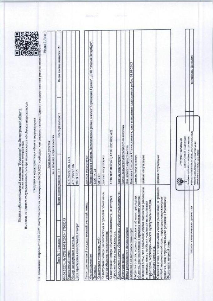 Земельный участок, расположенный по адресу: Ленинградская область, Всеволожский район, массив "Корневские Гривки", ДНП "Малый Петербург" общ. пл. 1200+/-24 кв.м. кад 47:07:0957006:1371