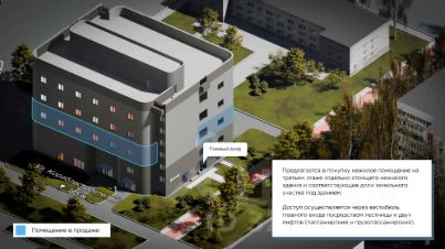 Предлагается к продаже нежилое помещение на третьем этаже отдельно стоящего нежилого здания с долями земельного участка.