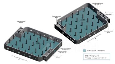Площадь: 939,8 м² (чистая арендопригодная площадь, без учета лестниц, лифтовых холлов и колонн)