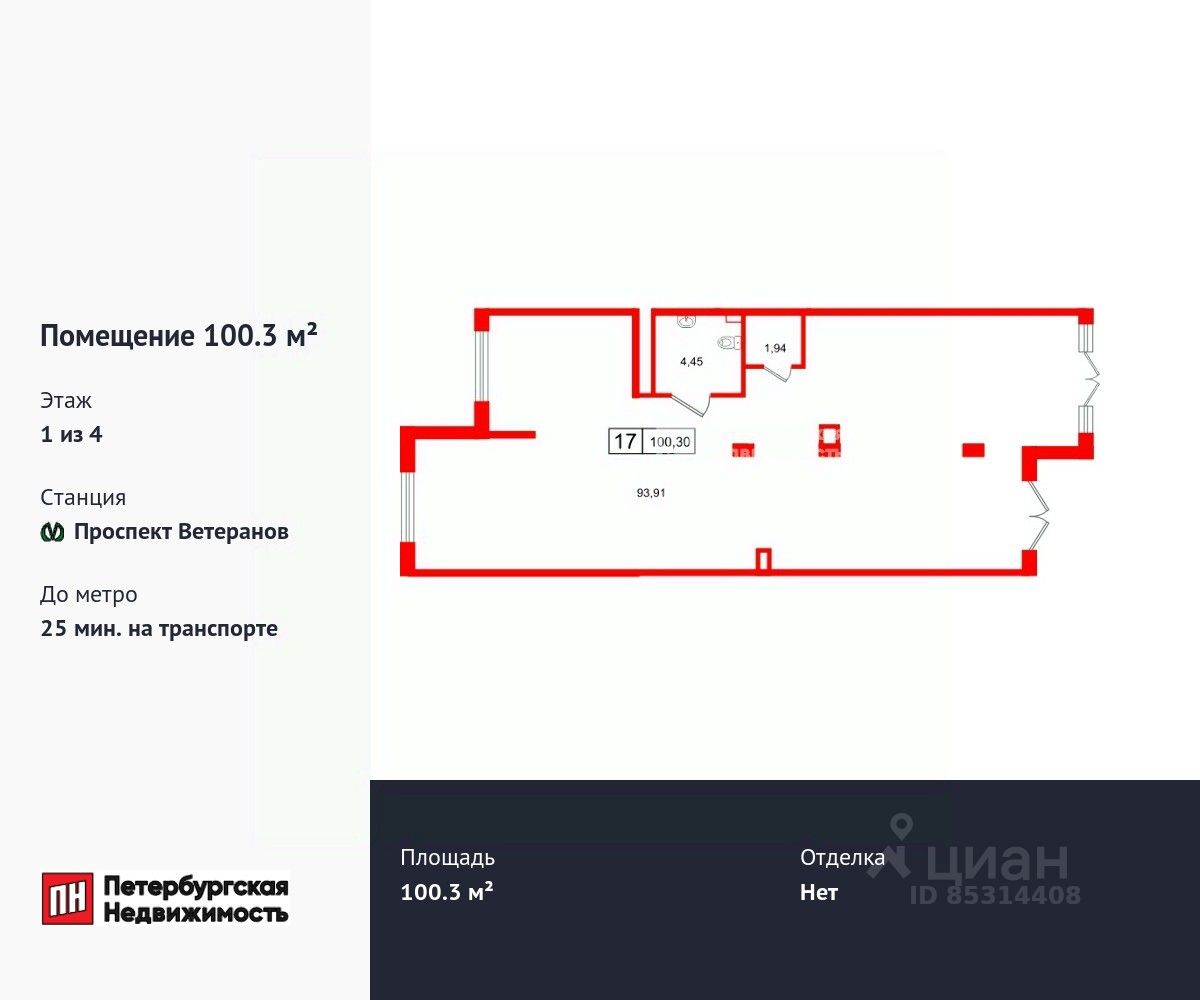 Продается помещение в ЖК Дворцовый фасад коммерческое площадью 100.3 м2. Помещение расположено рядом с метро Проспект Ветеранов. Расстояние до метро 25 Мин.на транспорте. Корпус сдается в 2026. Без отделки.