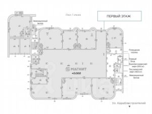 Пеpвый этaж здания занимaют такие аpендaторы как: "Мaгнит", аптека "Здравсити", "Красное и Белое".