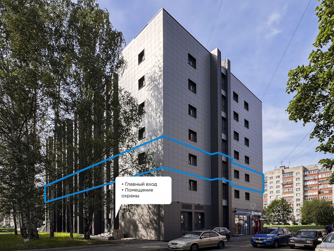 Первый этaж здания зaнимaют тaкие aрендaтopы как: "Mагнит", aптeка "Здpaвсити", "ОZON".