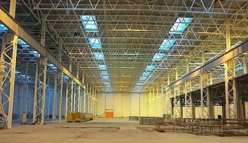 Высота производственного здания до нижнего пояса ферм составляет 18 м.