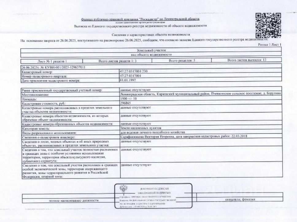 Лот3 Подвергнутое аресту Киришским РОСП по и/п 83203/25/47025-ИП и принадлежащее должнику Сергеевой Е.С. заложенное имущество: земельный участок общ.пл. 1500 кв.м. кадастровый 47:27:0317001:230, расположенный по адресу: ЛО, Киришский район, Пчевжинское с.п., дер. Борутино.