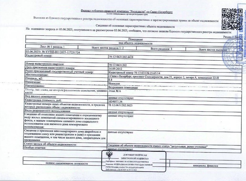 нежилое помещение по адресу: г. Санкт-Петербург, пр. Солидарности, д. 21, корп.2, лит. А, пом.22-Н, общ. пл. 8,8 кв.м., кадастровый номер 78:12:0631202:4418