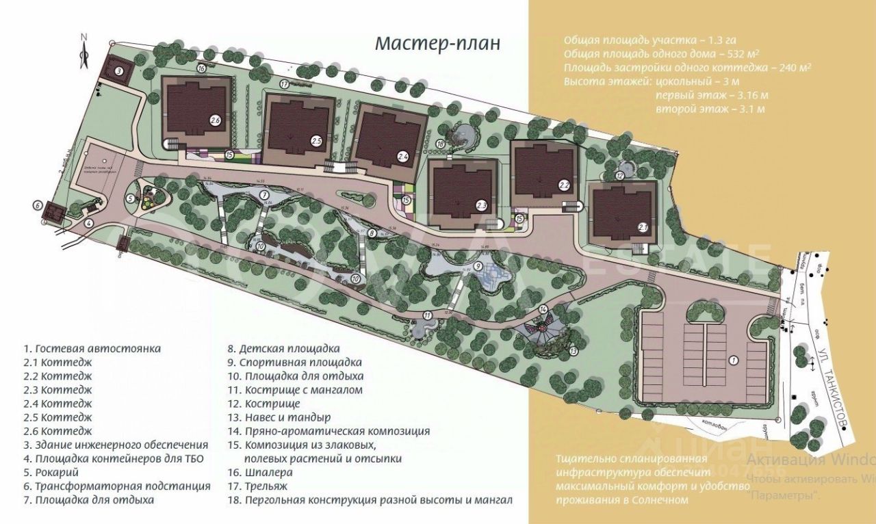 Данный проект предполагает клубный формат поселка как арендный или гостиничный бизнес. Вид разрешенного использования земли: для размещения гостиниц. Благоустройство территории предполагает несколько зон для семейного отдыха детская и спортивная площадки, прогулочные дорожки, костровая и зона барбекю, гостевая парковка на 30 автомобилей.