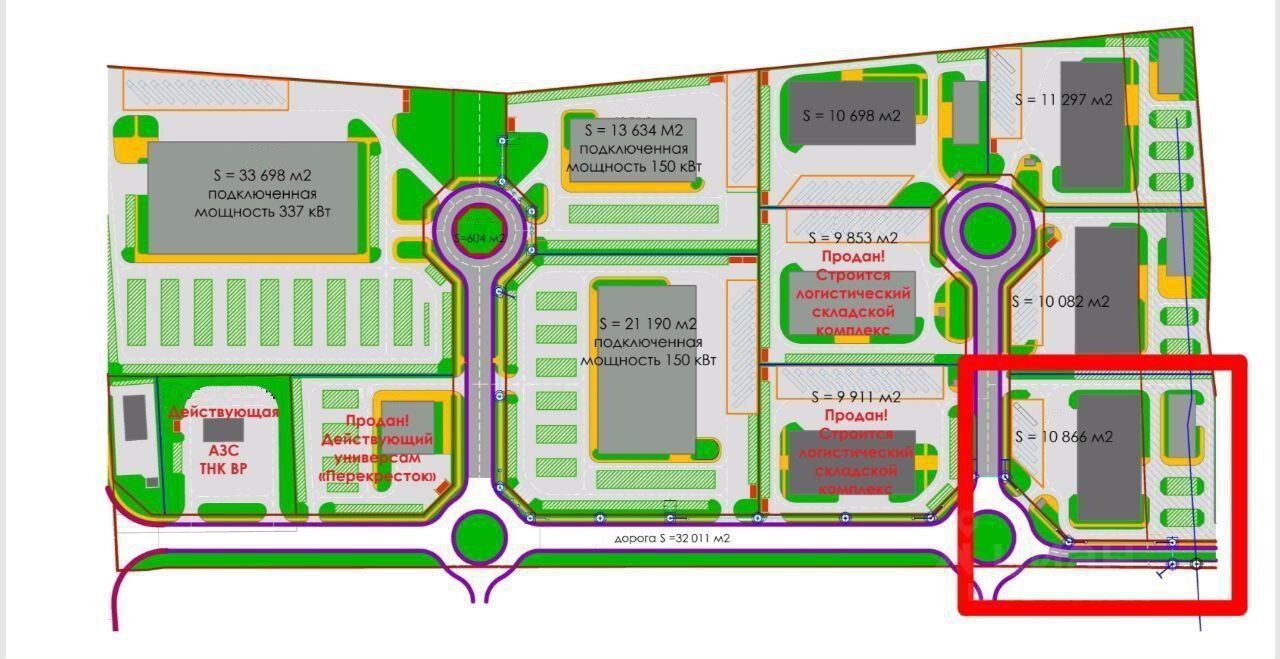 Четыре участка на территории уже проданы, на них функционируют АЗС ТНК ВР (РОСНЕФТЬ) и супермаркет "Перекресток", на двух строится логистический комплекс класса А.