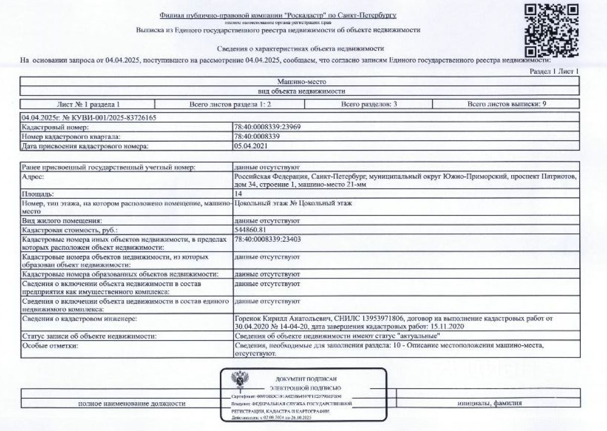 Лот1 (повторные) Подвергнутое аресту Красносельским РОСП по и/п 435775/23/78007-ИП и принадлежащее должнику Ульянцеву Р.В. арестованное имущество: машино-место общ.пл. 14 кв.м. кадастровый 78:40:0008339:23969, расположенное по адресу: Санкт-Петербург, пр. Патриотов, д.34, стр. 1.