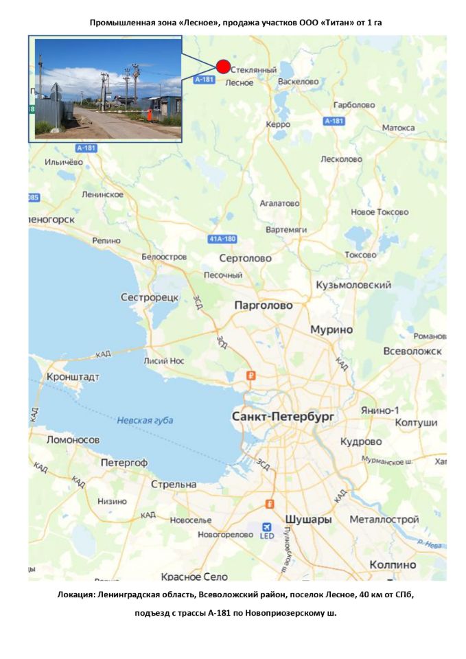 Транспортная инфраструктура объекта хорошо развита и удаленность промышленной зоны Лесное от федеральной трассы А-181 составляет 850 м. Выгодное транспортно-логистическое расположение объекта - 40 км от КАД СПб, и наличие на соседнем участке действующей ЖД ветки с примыканием к ст. Орехово Октябрьской ЖД, позволяет эффективно использовать мощности портовой инфраструктуры портов СПб и Выборга, для создания накопительного хаба или перевалочной базы для поставки и хранения различных грузов.