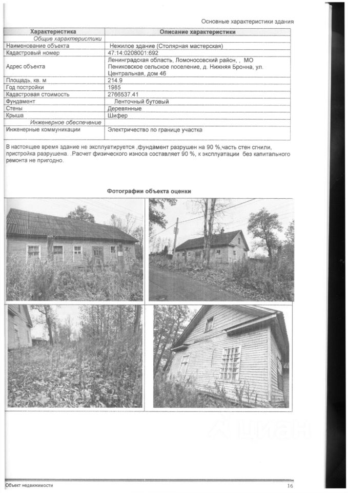 Земельный участок, площадью 2500 кв.м., кадастровый номер 47:14:0208006:228, категория земель земли населенных пунктов, вид разрешенного использования для индивидуального жилищного строительства, и нежилое здание столярной мастерской, общей площадью 214,9 кв.м., кадастровый номер 47:14:0208001:692 расположенные по адресу: Российская Федерация, Ленинградская область, Ломоносовский муниципальный район, Пениковское сельское поселение, деревня Нижняя Бронна, улица Центральная, земельный участок 46;