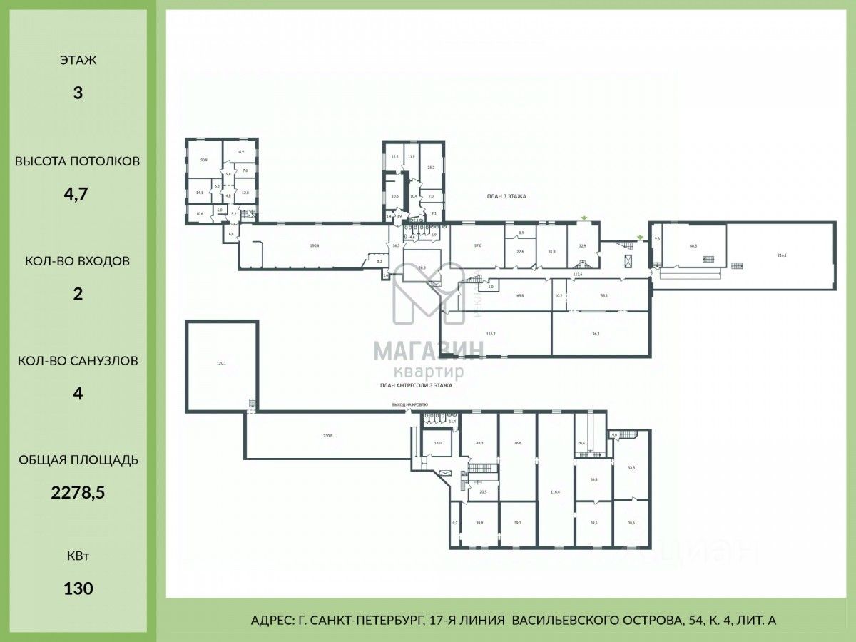 Площадь 3 этажа - 1356,9 м2, площадь антресоли - 921,6 м2.