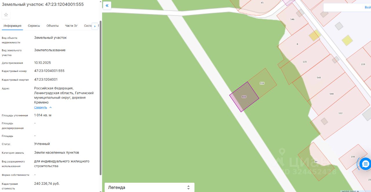 Земельный участок с кадастровым номером 47:23:1204001:555, площадью 1014 (одна тысяча четырнадцать) кв.м., расположен по адресу: Российская Федерация, Ленинградская область, Гатчинский муниципальный округ, деревня Кремено. Категория земель: земли населенных пунктов. Разрешенное использование: для индивидуального жилищного строительства. Граница земельного участка установлена в соответствии с требованиями земельного законодательства. Сведения об обременениях: Земельный участок частично расположен в границах зоны с особыми условиями использования территории: - площадь земельного участка, покрываемая зоной с особыми условиями использования территории, составляет "163" кв.м. Н-5 Водоохранная зона (по данным ПЗЗ); - площадь земельного участка, покрываемая зоной с особыми условиями использования территории, составляет "163" кв.м. Н-6 Прибрежная защитная полоса (по данным ПЗЗ).