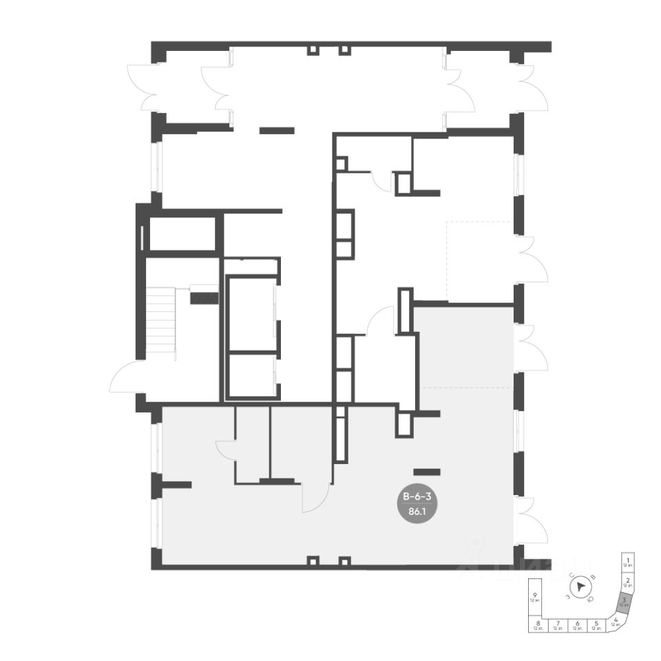 Продается помещение свободного назначения 6, по адресу Ленинградская область, Всеволожский муниципальный район, Муринское городское поселение, город Мурино, корпус 1 очередь, корпус 1.12 - встроенные помещения в Ягодное Река Парк на 1 этаже, с площадью 86.1 м2.