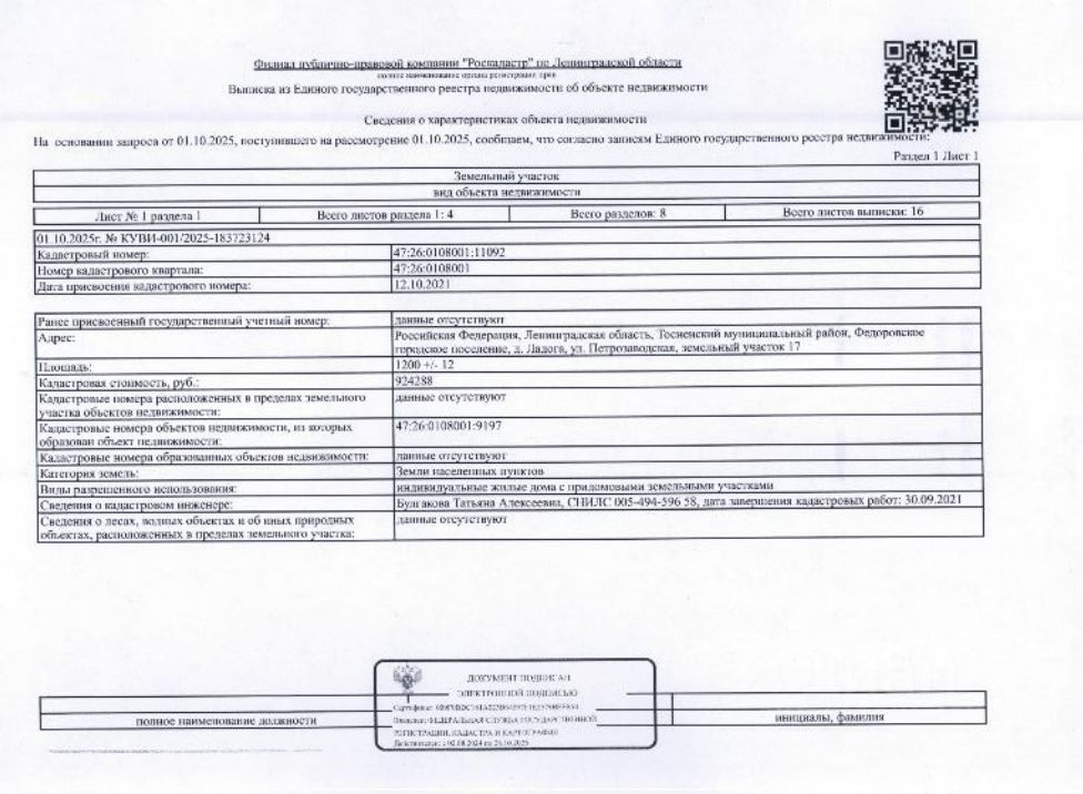 Лот1 Подвергнутое аресту Тосненским РОСП по и/п 367626/25/47035-ИП и принадлежащее должнику Абисалову А.Б. заложенное имущество: земельный участок общ.пл. 1200 кв.м. кадастровый 47:26:0108001:11092, расположенный по адресу: ЛО, Тосненский район, Федоровское г.п., д. Ладога, ул. Петрозаводская, уч. 17.