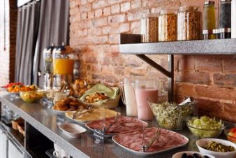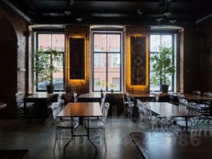 На первом этаже расположен ресторан с большими витринными окнами, который в вечернее время используется как банкетный зал или зал для различных мероприятий.