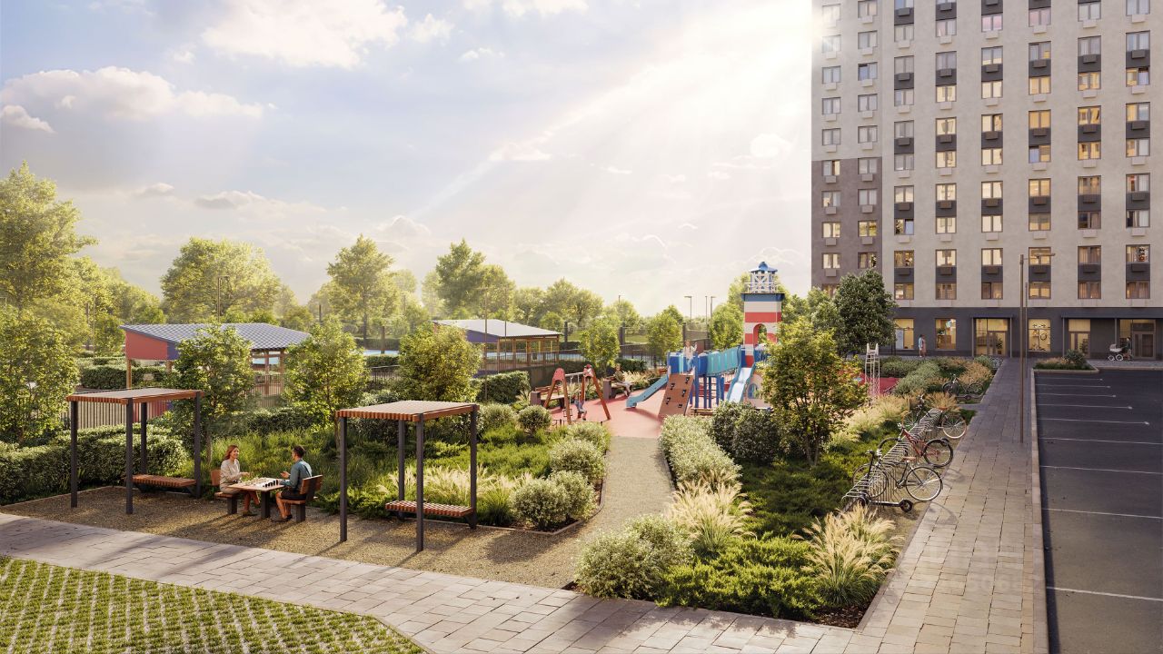 Школа и детский сад во дворе, современные игровые площадки и безбарьерная среда.