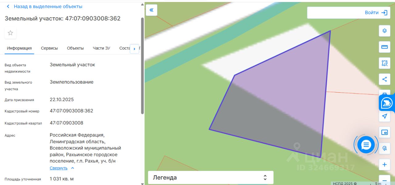 Земельный участок из земель, государственная собственность на которые не разграничена, с кадастровым номером 47:07:0903008:362, площадью 1031 кв.м, категория земель: земли населенных пунктов, вид разрешенного использования: для индивидуального жилищного строительства, расположенного по адресу: Российская Федерация, Ленинградская область, Всеволожский муниципальный район, Рахьинское городское поселение, г.п. Рахья, уч.б/н