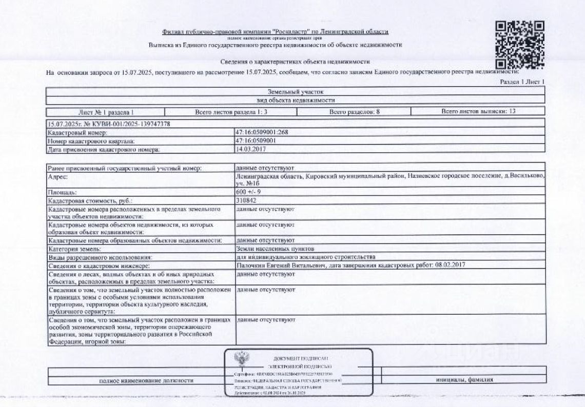 Лот1(повторные) Подвергнутое аресту Кировским РОСП по и/п 217703/24/47026-ИП и принадлежащее должнику Администрация МО Назиевское городское поселение Кировского МР ЛО заложенное имущество: земельный участок общ.пл. 600 кв.м. кадастровый 47:16:0509001:268, расположенный по адресу: ЛО, Кировский район, Назиевское г.п., д. Васильково, уч. 1б.
