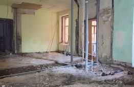 Никаких охранных элементов ни в доме, ни в самом помещении нет. Были выполнены работы по частичной замене старых перекрытий на металлические. Сейчас в помещении требуется ремонт.