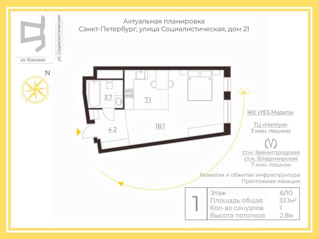 Студия 33,1м.кв. находится на высоком 6 этаже. Произведена отделка от застройщика с санузлом и кухонной зоной, а также было установлено кондиционировано.
