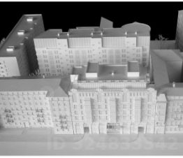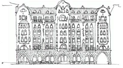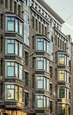 Решение фасадов построено на сочетании больших остеклённых плоскостей с глухими участками стен, облицованными натуральным камнем в контексте с исторической окружающей застройкой. Парафраз стиля модерн читается в использовании натурального камня, в скалистой рельефной текстуре стен, в трапециевидном завершении оконных проёмов. В отделке дворовых фасадов применена тонкая декоративная штукатурка.