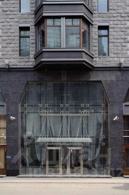 Решение фасадов построено на сочетании больших остеклённых плоскостей с глухими участками стен, облицованными натуральным камнем в контексте с исторической окружающей застройкой. Парафраз стиля модерн читается в использовании натурального камня, в скалистой рельефной текстуре стен, в трапециевидном завершении оконных проёмов.