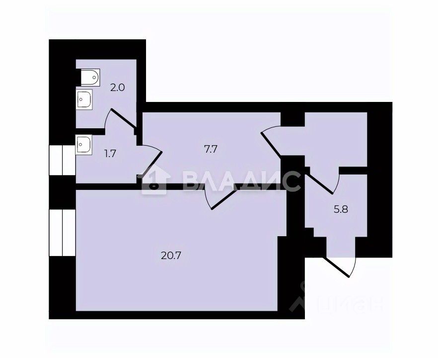 Высота потолков 2,4 метра, 2 комнаты 20,7 кв.м и 7,7 кв.м, 2 санузла.