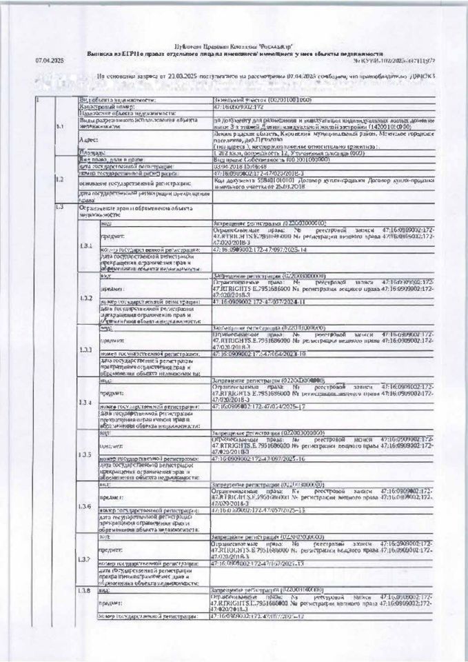 Подвергнутое аресту СОСП по Ленинградской области ГМУ ФССП России по исполнительному производству 15102/23/98047-ИП от 02.10.2023г. в пользу взыскателя МИФНС 11 по Ленинградской области, принадлежащее должнику Дячок И.М. имущество: Земельный участок площадью 1262 +/- 12 кв.м, кад. 47:16:0909002:172, категория земель: земли населенных пунктов, виды разрешенного использования: для размещения и использования индивидуальных жилых домов не выше 3 этажа, расположенный по адресу: Ленинградская область, Кировский муниципальный район, Мгинское городское поселение, дер. Пухолово. Обременения: запрещение регистрации