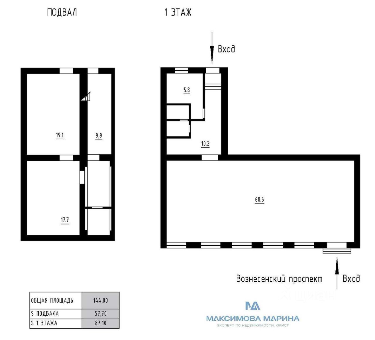 Площадь 144,8 кв.м.из которых 85 кв.м.имеет отдельный вход с улицы, пять арочных окон, сделан евроремонт.